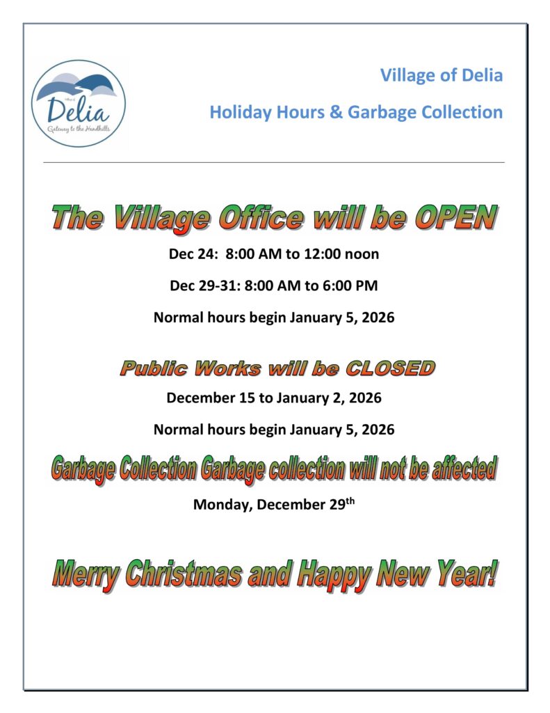 December 23, 2025 at the Village of Delia Office at 5:00 pm