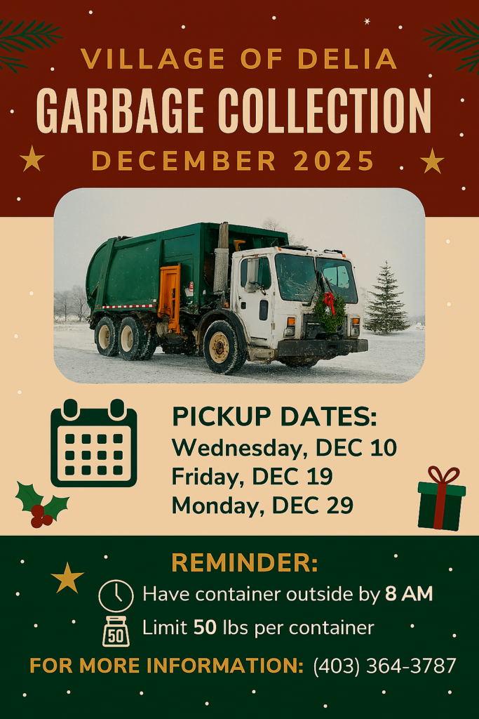 Regular Council Meetings: 2nd Thursday of the month at 6:30 p.m. Staring December 11, 2025 at the Delia and District Drop In Centre